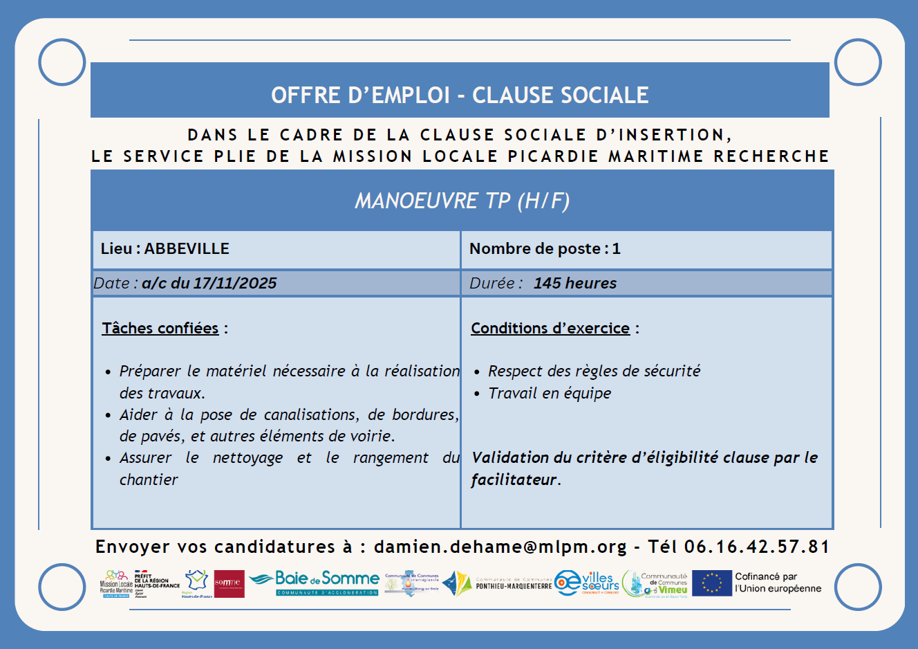 Manutention, Lecture de plans, Passage de pieuvres, Nettoyage du chantier